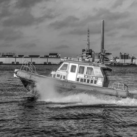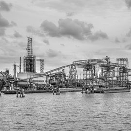 Kranen torenen boven alles uit, sleepboten glijden als reuzenmieren door het water, boulders liggen als vergeten reuzenstenen in het 'landschap'. Boorplatformen en kabelleggers rijzen op als stalen kathedralen in wording en de poten van thingemejigs staan als wachters van een andere wereld. Waar je ook kijkt, het uitzicht leeft, beweegt, verrast. Altijd.